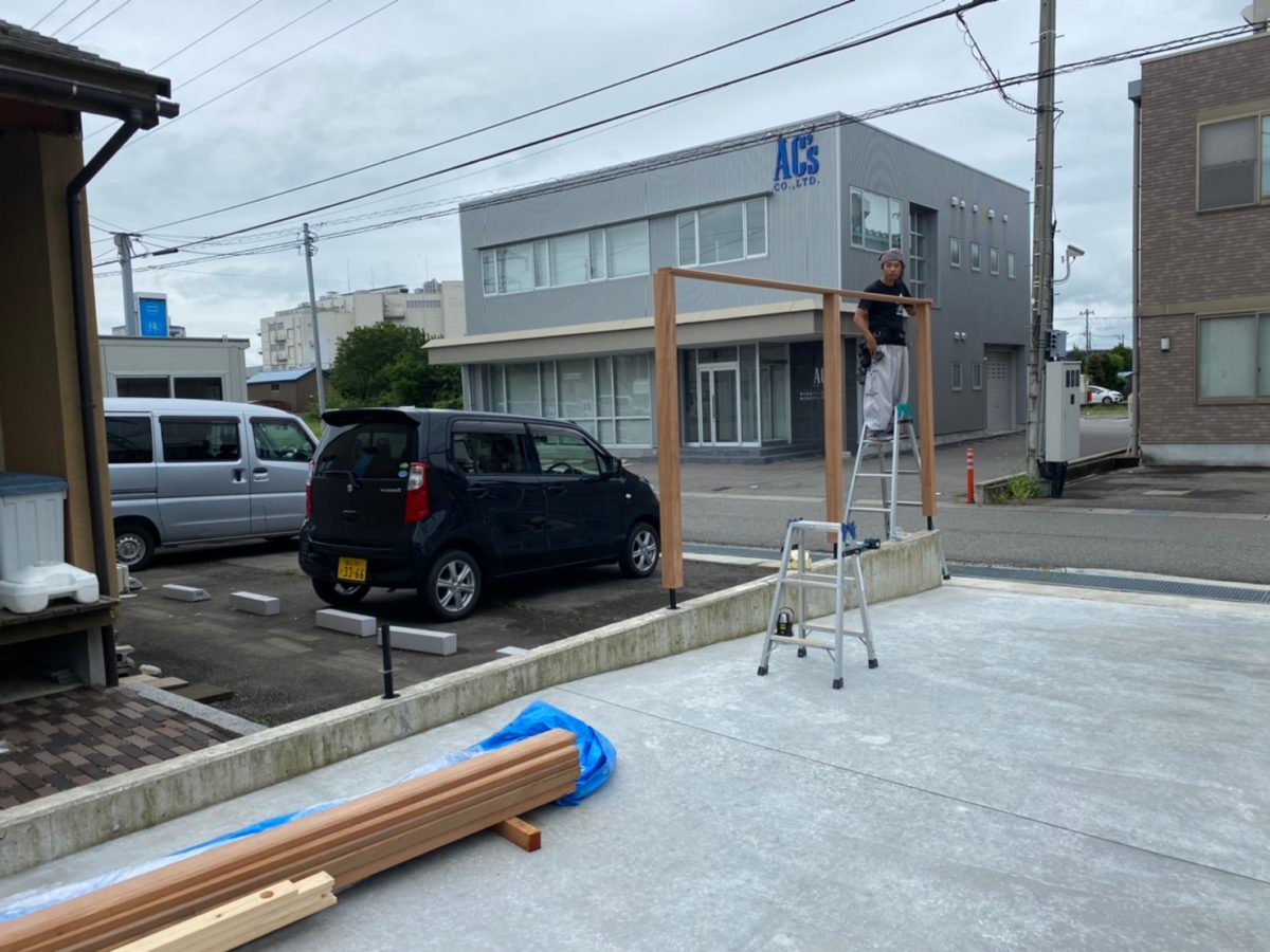 まずは、木製柱を取り付ける金物を固定して柱を立てていきます。