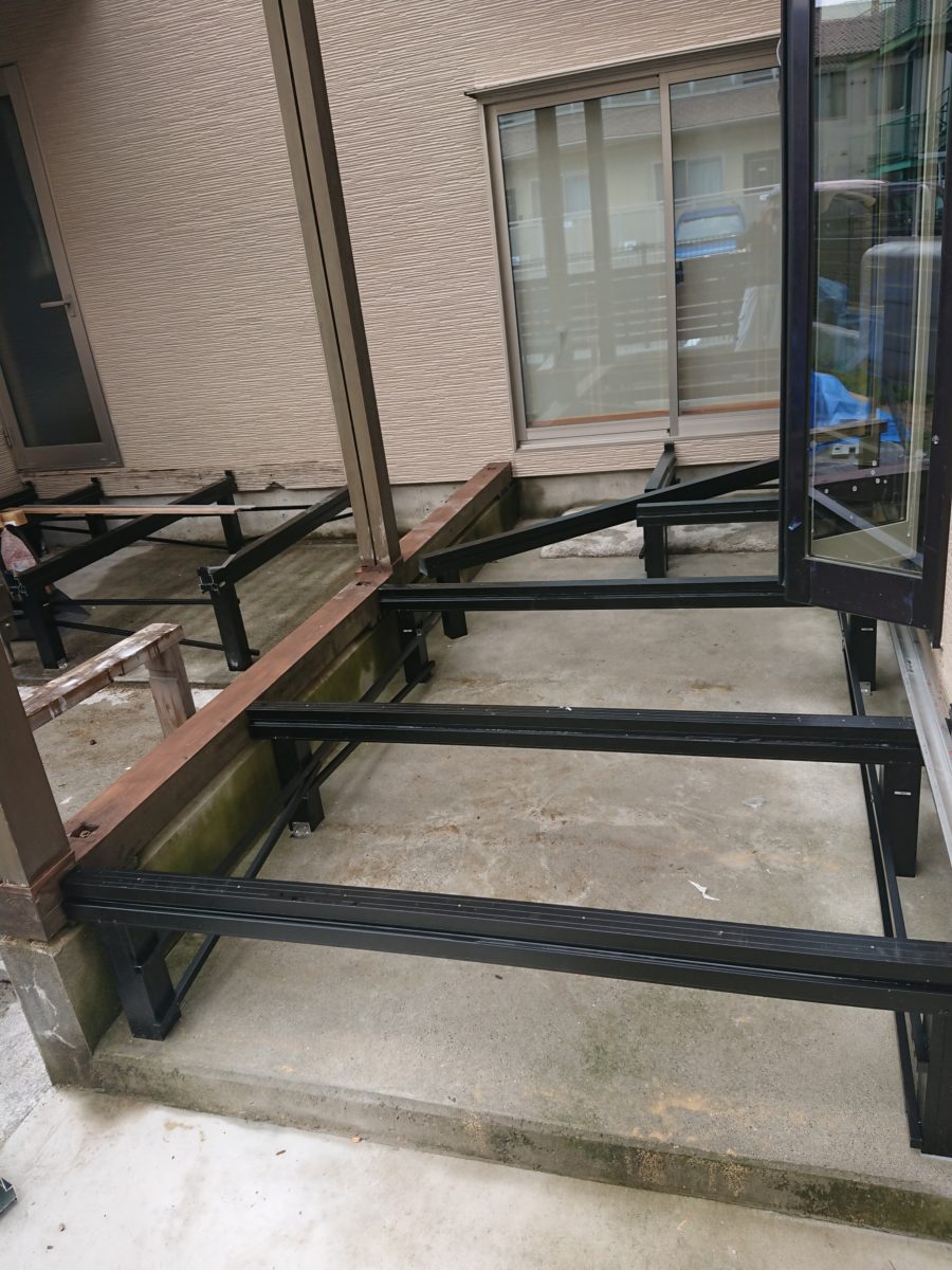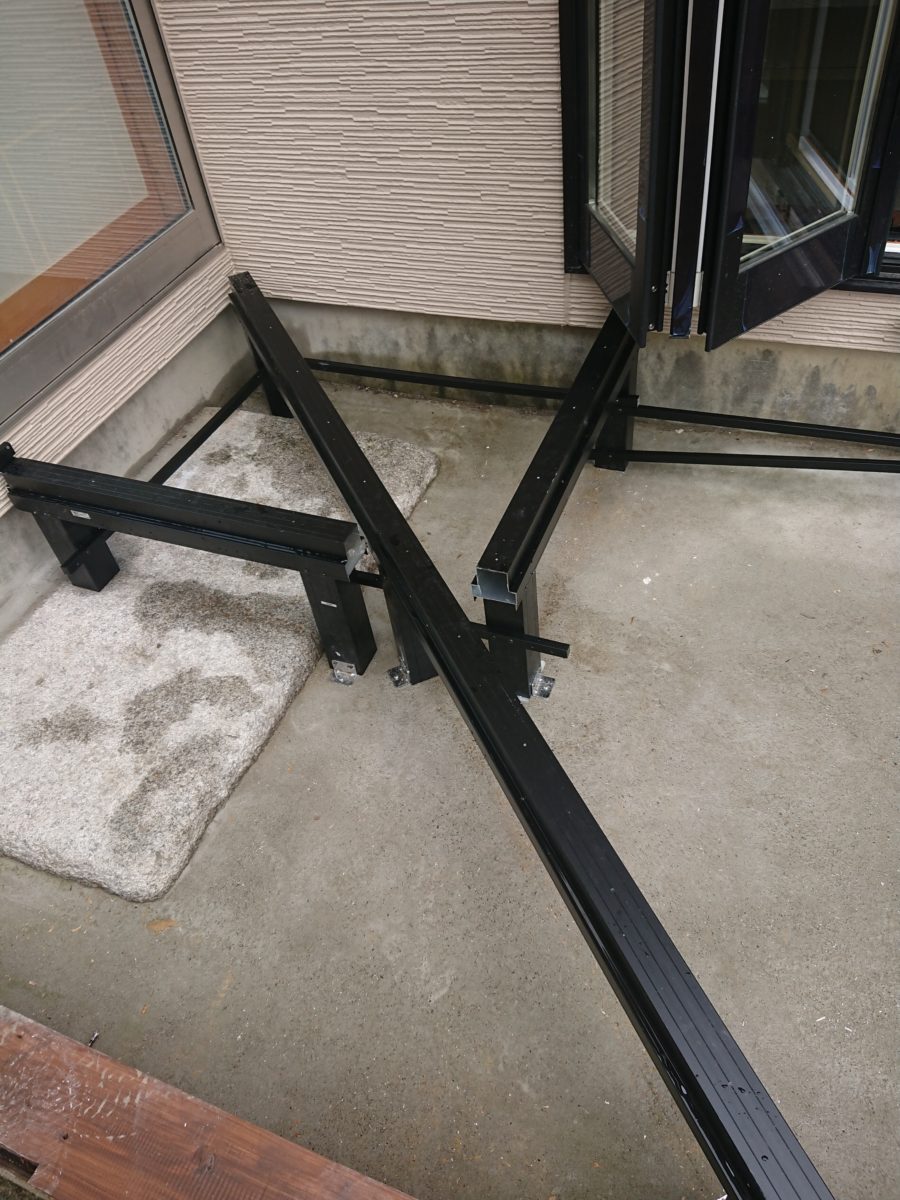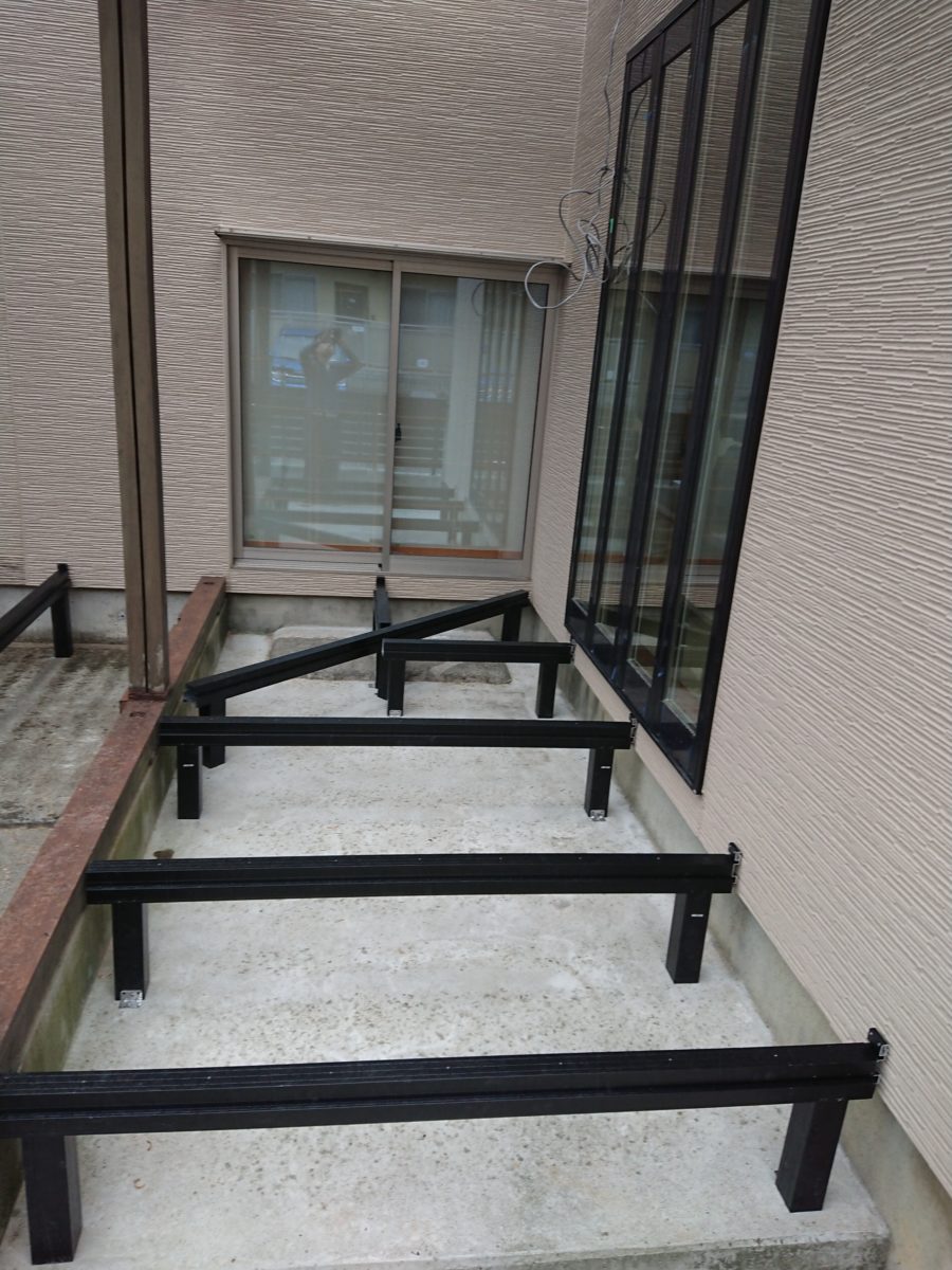 最初はアルミ束の位置出し、大引きの固定です。
