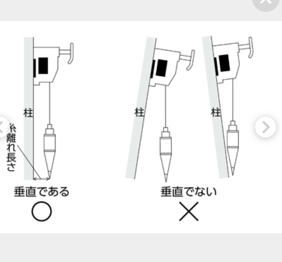 柱を立てた状態で下げ振りを使い直角を見ます。