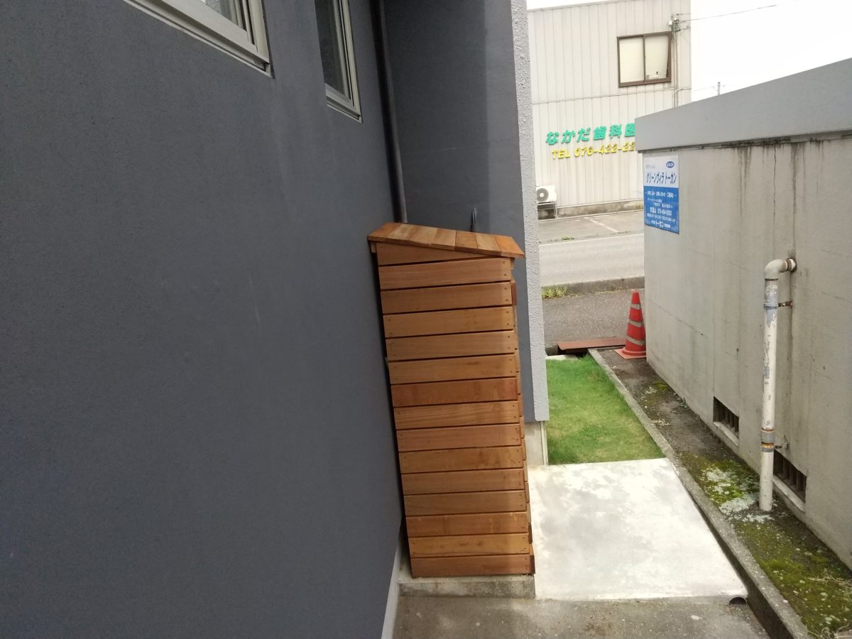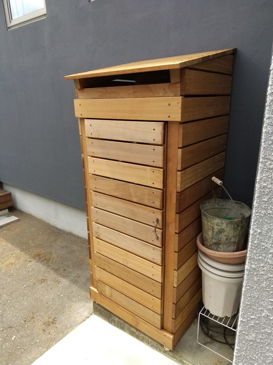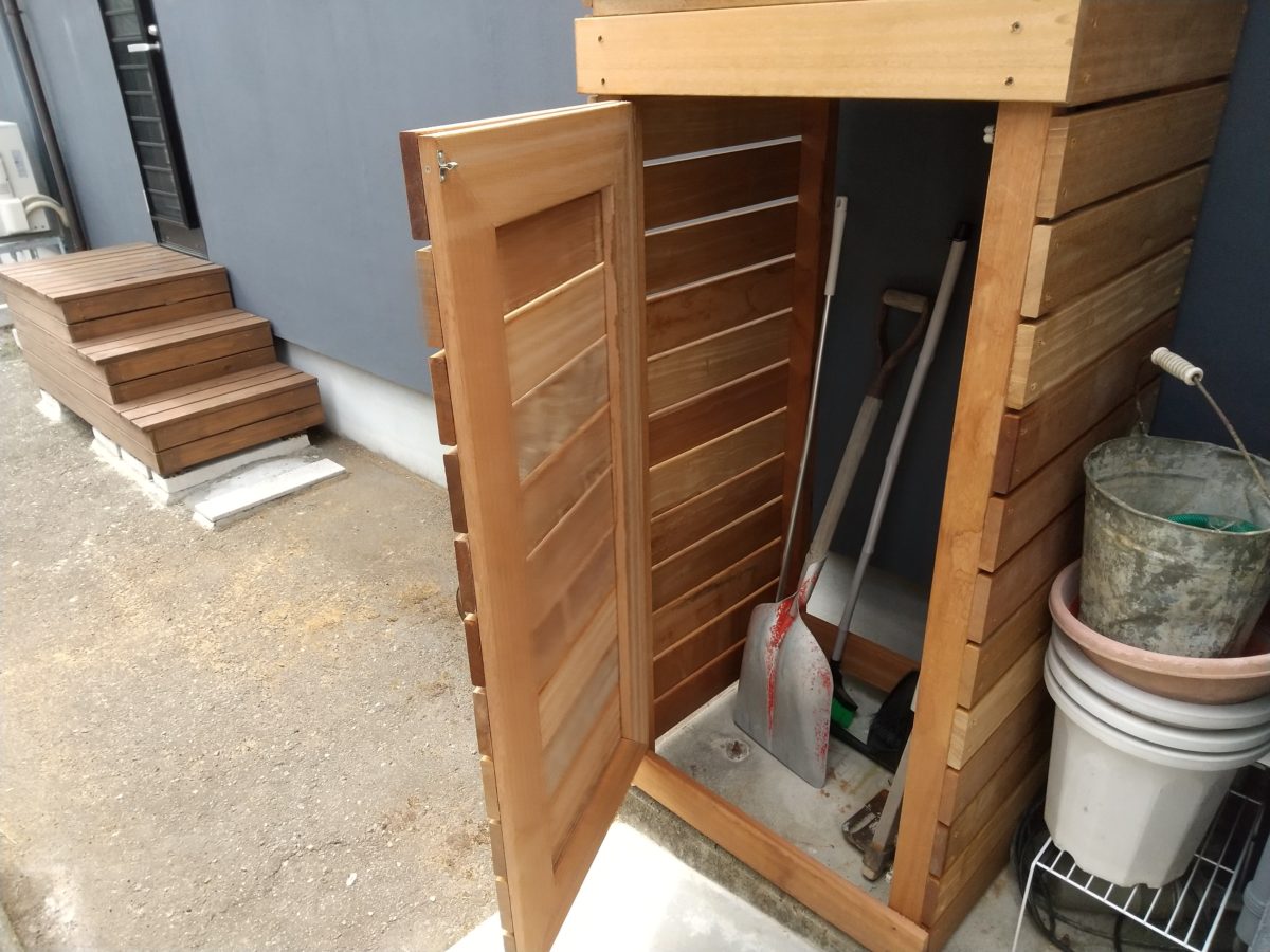 外部にちょっとした物入れを制作しました。