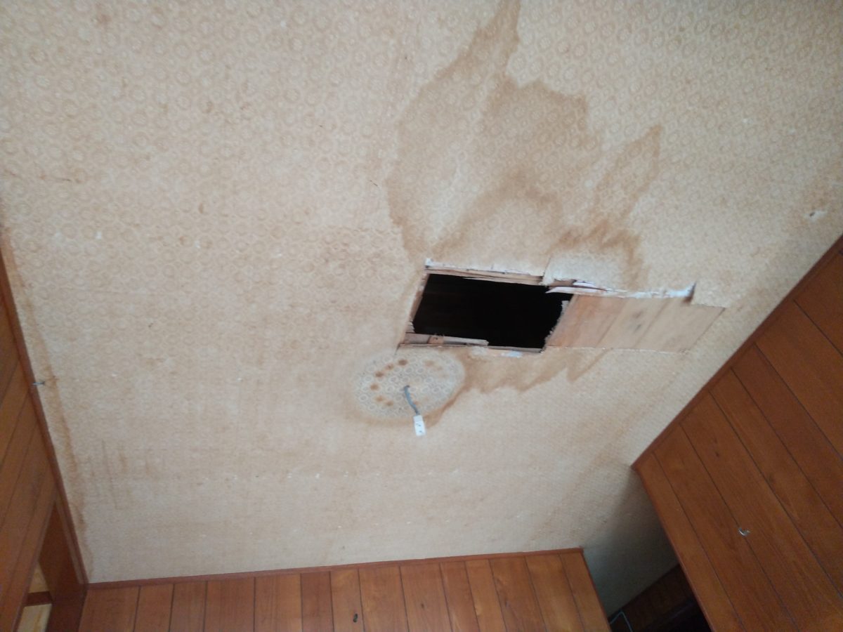 雨漏り確認の為、天井を剥がした部分。
